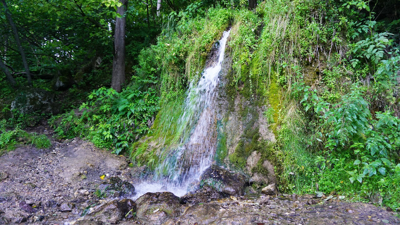 На самом деле, на речке Гремуха находится два водопада. Один – каскадный, достигает в высоту порядка 1 м. Второй представляет собой стекающий по скале поток, образованный ручьями и речушками, его высота – 2 м.
