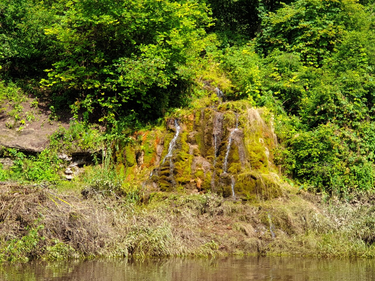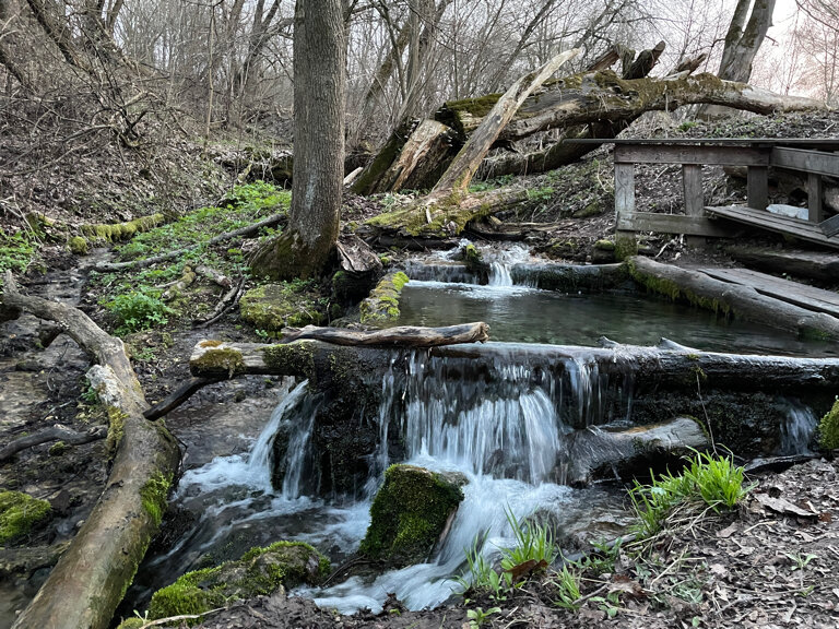 В этом месте множество ручьёв стекают по заросшим мхом склонам у реки Протва. Они переплетаются и создают причудливые узоры. Даже учитывая, что это всего-навсего ручейки, шум от них разносится по всей округе.